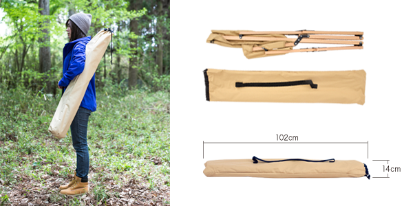 木製フレームの中央集約型、折りたたみキャンプチェア。快適な座り心地で、ナチュラルにキャンプサイトを演出。白木フレームにブラック金具が映えます。